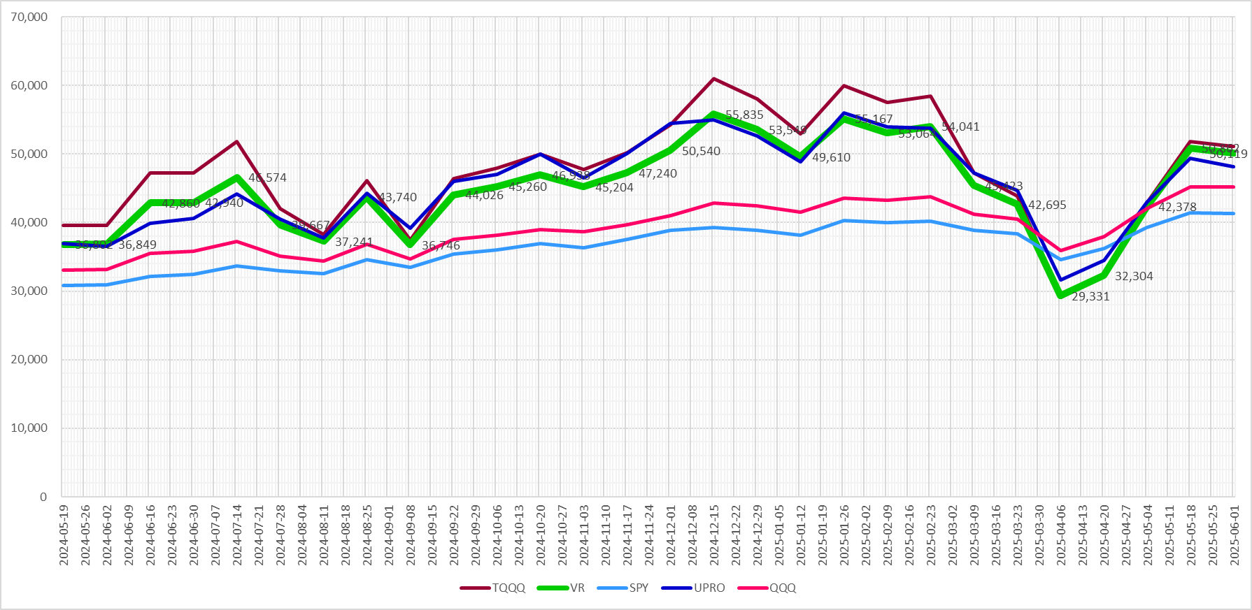 트럼프발 관세 이슈로 촉발된 하락폭에서 극적인 반전 사이클이 시작되었습니다. VR은 TQQQ, UPRO와 함께 1배수 ETF대비 나은 성과를 보여주고 있습니다. 반등의 분위기가 얼마나 이어질지 모를 일입니다. 계속 이어질수도 있고, 다시 하락 반전할 수도 있습니다. 늘 그래왔듯 계획대로 계속 진행하겠습니다.