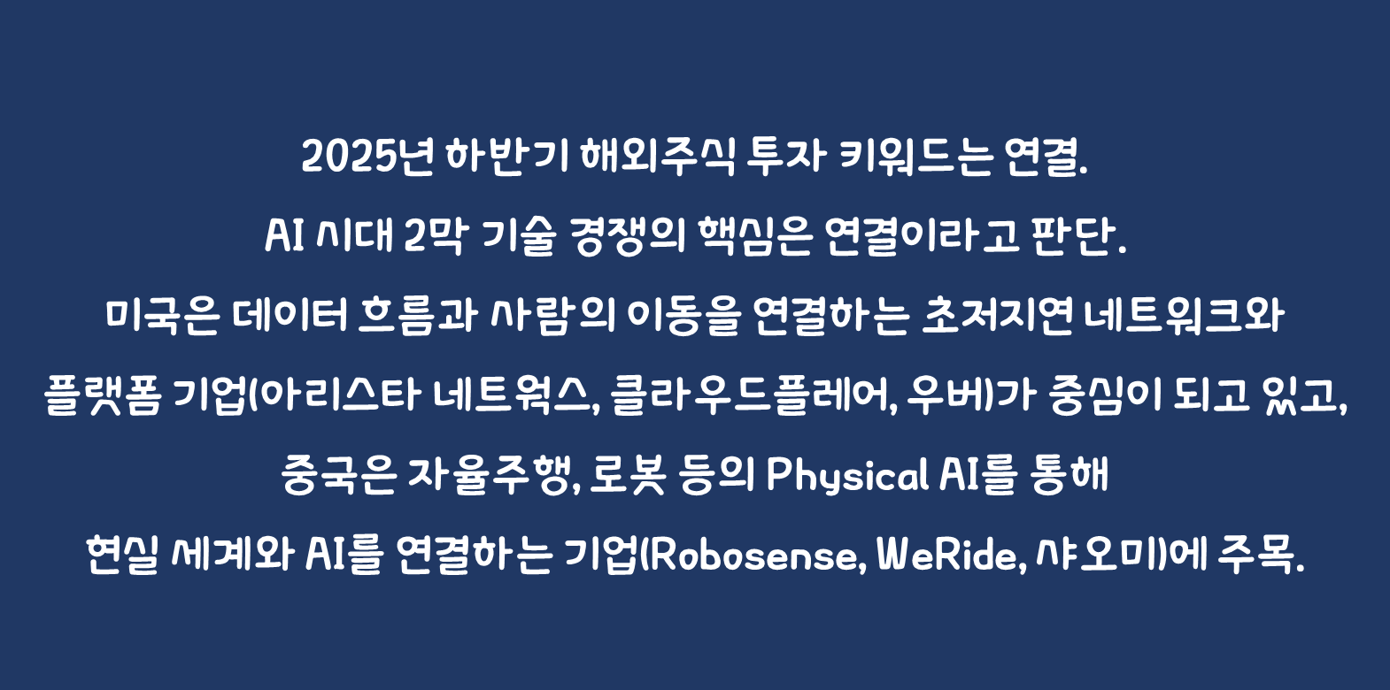 2025년 하반기 해외주식 투자 키워드는 연결. AI 시대 2막 기술 경쟁의 핵심은 연결이라고 판단. 미국은 데이터 흐름과 사람의 이동을 연결하는 초저지연 네트워크와 플랫폼 기업(아리스타 네트웍스, 클라우드플레어, 우버)가 중심이 되고 있고, 중국은 자율주행, 로봇 등의 Physical AI를 통해 현실 세계와 AI를 연결하는 기업(Robosense, WeRide, 샤오미)에 주목. 일본은 방산, 결제 등 전통 인프라에 기반해 안정적으로 연결을 강화하며 주식시장의 느리지만 탄탄한 회복을 시현할 전망. 방식은 다르지만, 무엇을 어떻게 연결할 것인가를 중심으로 기술 경쟁을 지속할 것.