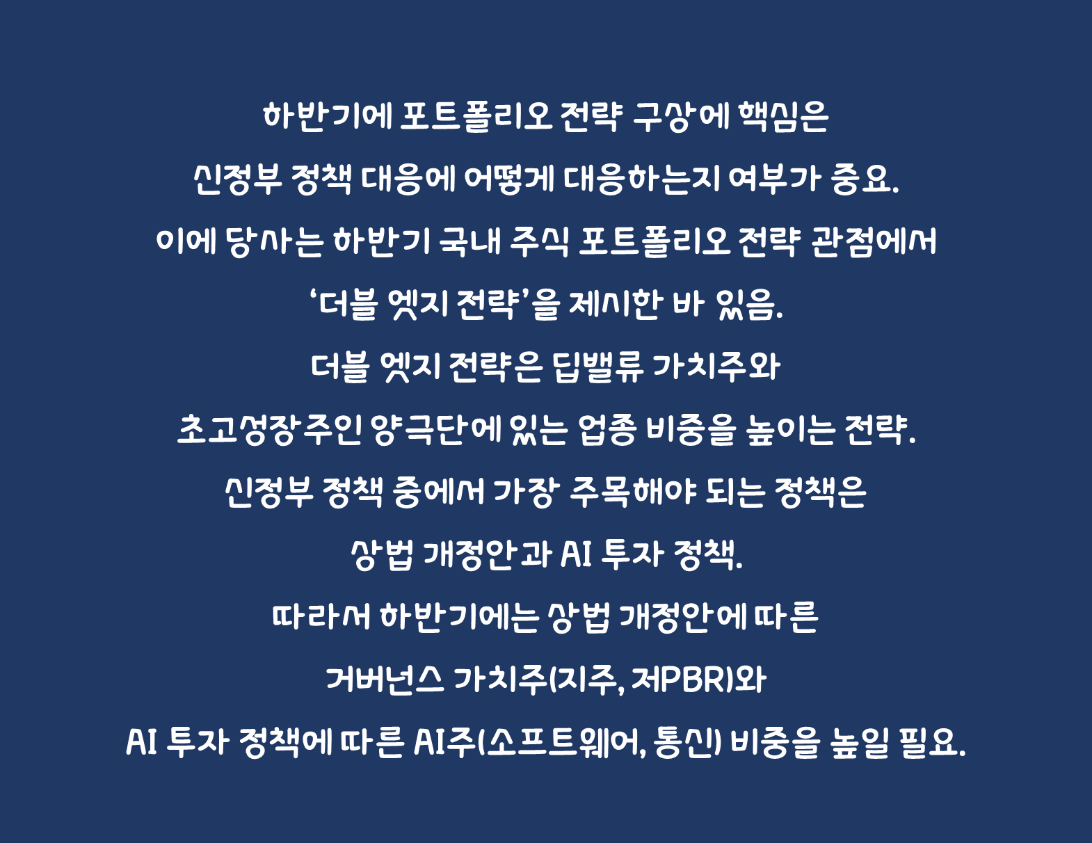 포트폴리오 전략: 하반기에 포트폴리오 전략 구상에 핵심은 신정부 정책 대응에 어떻게 대응하는지 여부가 중요. 이에 당사는 하반기 국내 주식 포트폴리오 전략 관점에서 ‘더블 엣지 전략’을 제시한 바 있음. 더블 엣지 전략은 딥밸류 가치주와 초고성장주인 양극단에 있는 업종 비중을 높이는 전략. 신정부 정책 중에서 가장 주목해야 되는 정책은 상법 개정안과 AI 투자 정책. 따라서 하반기에는 상법 개정안에 따른 거버넌스 가치주(지주, 저PBR)와 AI 투자 정책에 따른 AI주(소프트웨어, 통신) 비중을 높일 필요.