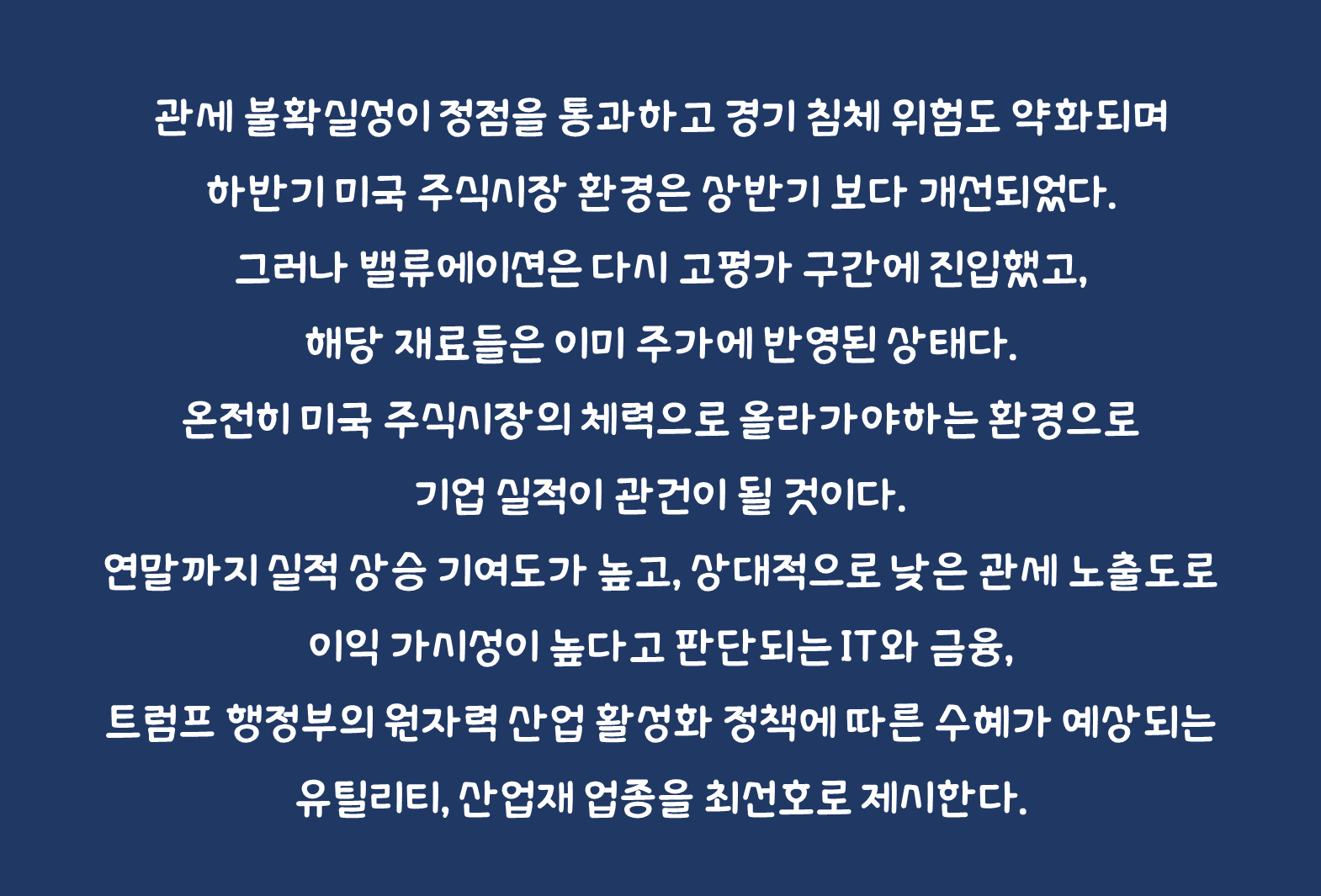 연말까지 실적 상승 기여도가 높고, 상대적으로 낮은 관세 노출도로 이익 가시성이 높다고 판단되는 IT와 금융, 트럼프 행정부의 원자력 산업 활성화 정책에 따른 수혜가 예상되는 유틸리티, 산업재 업종을 최선호로 제시한다. 이외 알파 전략으로 정책 드라이브가 지속될 원전 밸류체인, 디지털 자산, 군비 확충 경쟁과 국경 안보 정책 예산 확대 기대에 따른 안보, 그리고 피지컬 AI 테마 확장에 따른 로봇, 자동화 테마를 선호한다.