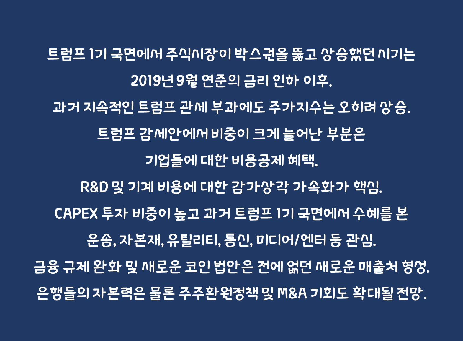 트럼프 감세안에서 비중이 크게 늘어난 부분은 기업들에 대한 비용공제 혜택. R&D 및 기계 비용에 대한 감가상각 가속화가 핵심. CAPEX 투자 비중이 높고 과거 트럼프 1기 국면에서 수혜를 본 운송, 자본재, 유틸리티, 통신, 미디어/엔터 등 관심.