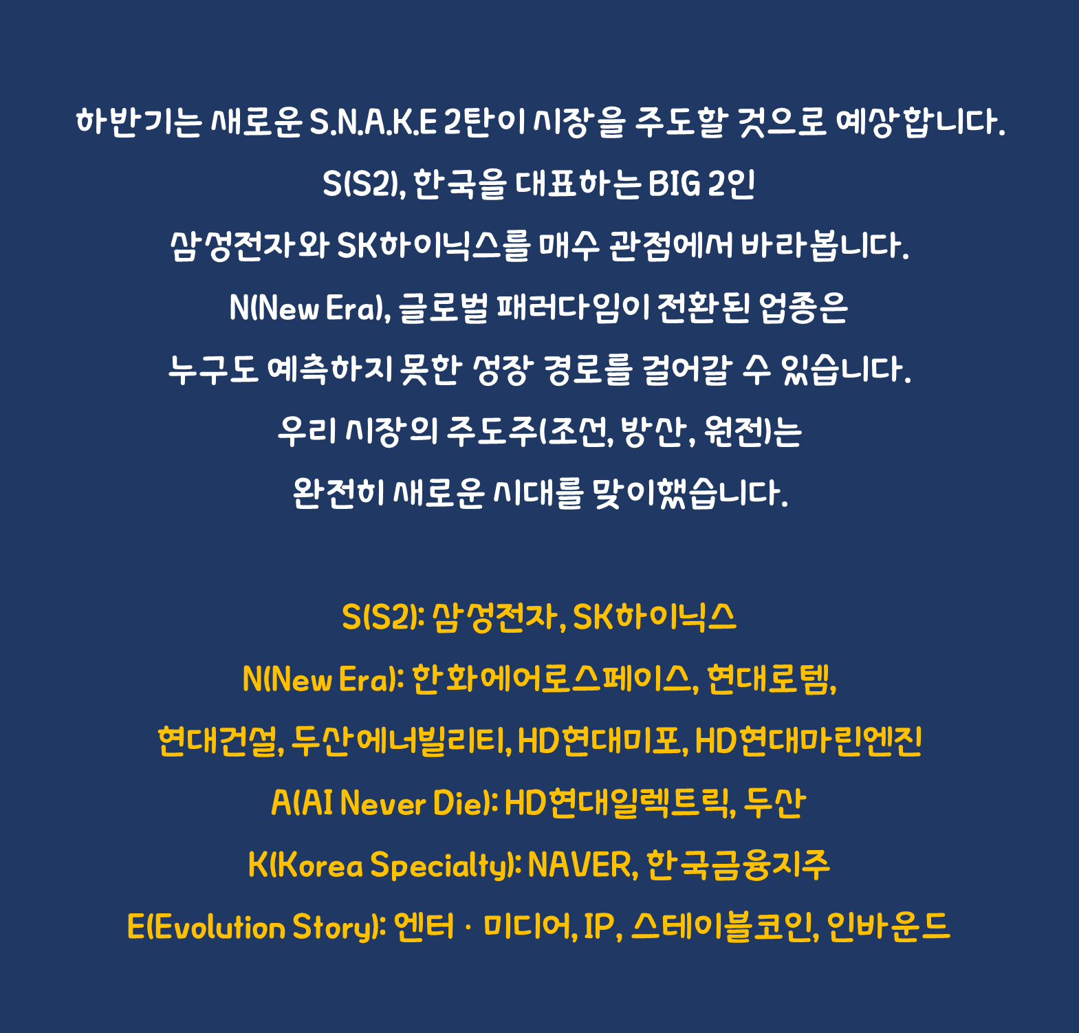 하반기는 새로운 S.N.A.K.E 2탄이 시장을 주도할 것으로 예상합니다. S(S2), 한국을 대표하는 BIG 2인 삼성전자와 SK하이닉스를 매수 관점에서 바라봅니다. 코스피의 추세적인 상승은 S2가 이끌 것으로 전망합니다. N(New Era), 글로벌 패러다임이 전환된 업종은 누구도 예측하지 못한 성장 경로를 걸어갈 수 있습니다. 우리 시장의 주도주(조선, 방산, 원전)는 완전히 새로운 시대를 맞이했습니다. A(AI Never Die), 일시적인 부침은 있을지언정 AI 시대는 끝나지 않았습니다. AI 반도체와 전력기기의 상승 추세는 꺾이지 않을 전망입니다. K(Korea Specialty), 한국 고유의 특수성에 주목합니다. 거래대금 활성화에 따른 금융주와 한국의 대표 AI 플랫폼 기업에 주목합니다. E(Evolution Story), 새로운 스토리가 기대되는 산업에 주목합니다. 스테이블코인, 특별한 IP, 한국의 엔터·콘텐츠 산업은 새로운 스토리 속에서 차별적인 성장세를 이어 나갈 것으로 기대됩니다.