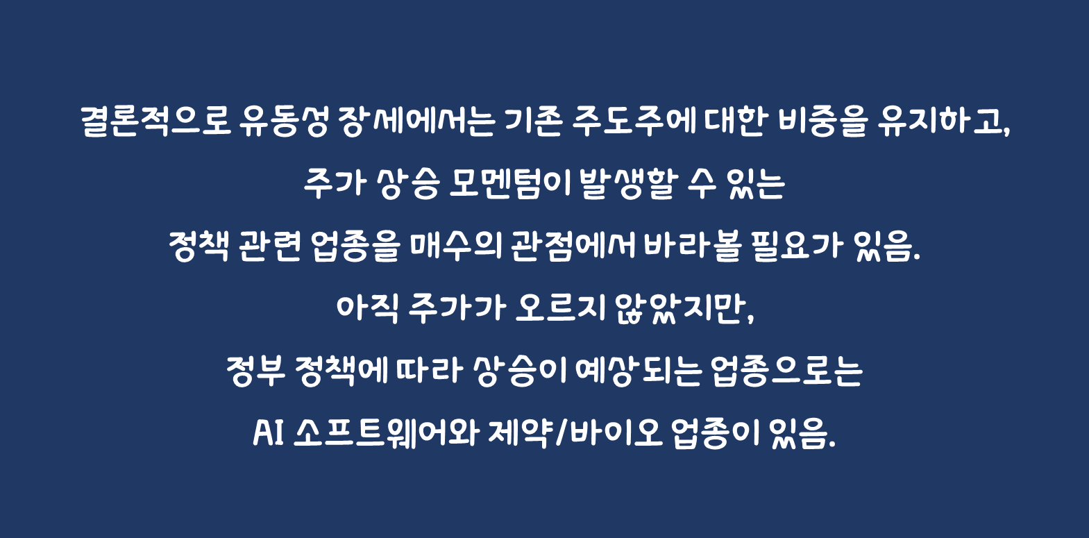 결론적으로 유동성 장세에서는 기존 주도주에 대한 비중을 유지하고, 주가 상승 모멘텀이 발생할 수 있는 정책 관련 업종을 매수의 관점에서 바라볼 필요가 있음- 아직 주가가 오르지 않았지만, 정부 정책에 따라 상승이 예상되는 업종으로는 AI 소프트웨어와 제약/바이오 업종이 있음.