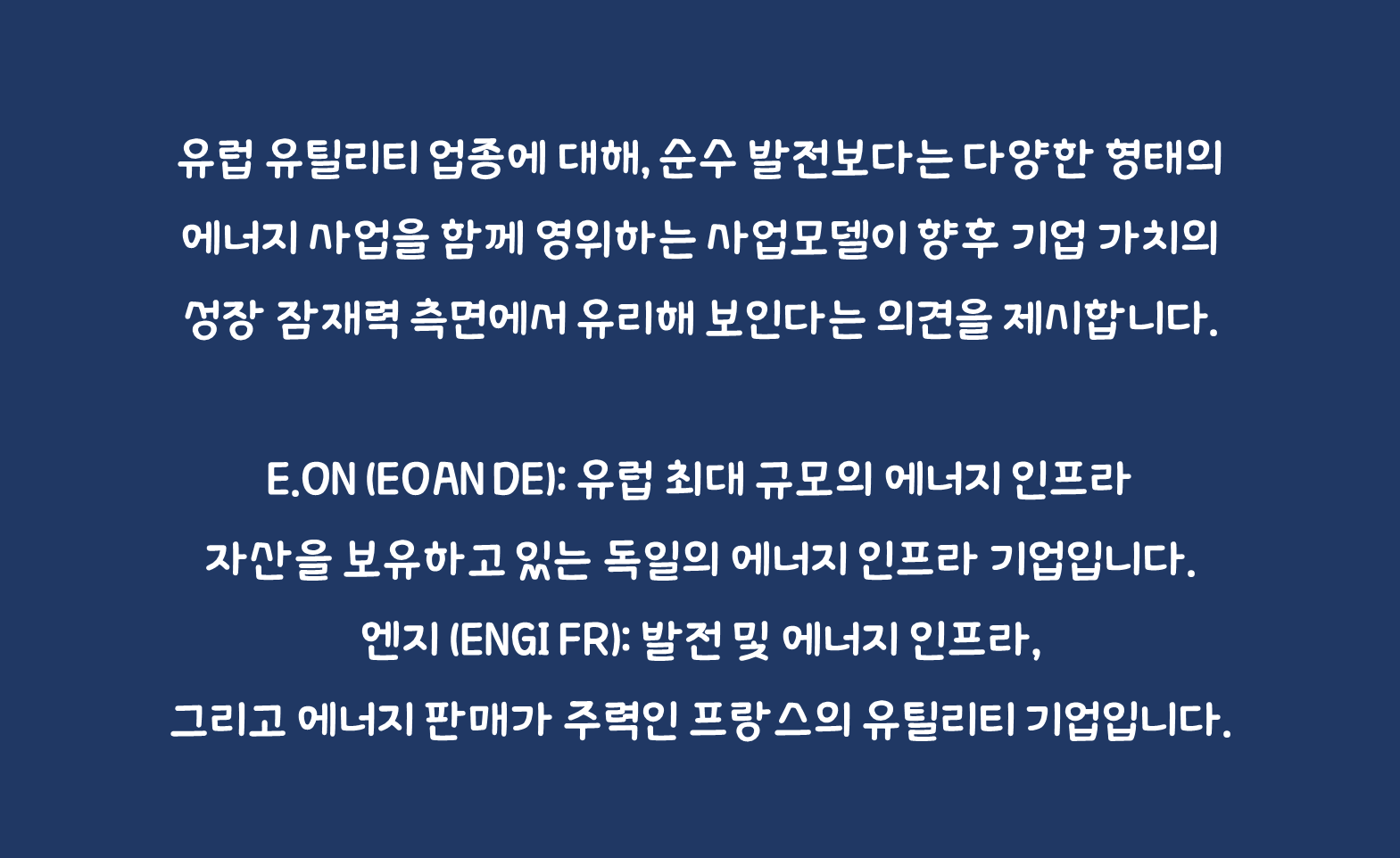 유럽 유틸리티 업종에 대해, 순수 발전보다는 다양한 형태의 에너지 사업을 함께 영위하는 사업모델이 향후 기업 가치의 성장 잠재력 측면에서 유리해 보인다는 의견을 제시합니다. 사업 모델은 평범하지만, 믿음직한 Valuation과 주주 가치 환원 정책을 보유한 유럽의 대표 에너지 인프라 기업들로 다음의 두 개 기업들을 선별하였습니다.