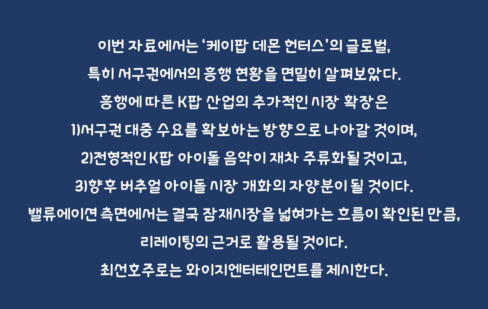 이번 자료에서는 ‘케이팝 데몬 헌터스’의 글로벌, 특히 서구권에서의 흥행 현황을 면밀히살펴보았다. 흥행에 따른 K팝 산업의 추가적인 시장 확장은 1)서구권 대중 수요를 확보하는 방향으로 나아갈 것이며, 2)전형적인 K팝 아이돌 음악이 재차 주류화될 것이고, 3)향후 버추얼 아이돌 시장 개화의 자양분이 될 것이다. 밸류에이션 측면에서는 결국 잠재시장을 넓혀가는 흐름이 확인된 만큼, 리레이팅의 근거로 활용될 것이다.