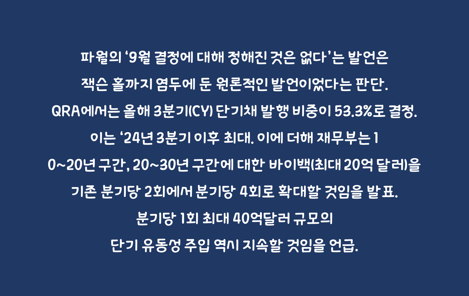금일 파월의 ‘9월 결정에 대해 정해진 것은 없다’는 발언은 잭슨 홀까지 염두에 둔 원론적인 발언이었다는 판단. QRA에서는 올해 3분기(CY) 단기채 발행 비중이 53.3%로 결정. 이는 ‘24년 3분기 이후 최대. 이에 더해 재무부는 10~20년 구간, 20~30년 구간에 대한 바이백(최대 20억 달러)을 기존 분기당 2회에서 분기당 4회로 확대할 것임을 발표. 분기당 1회 최대 40억달러 규모의 단기 유동성 주입 역시 지속할 것임을 언급.