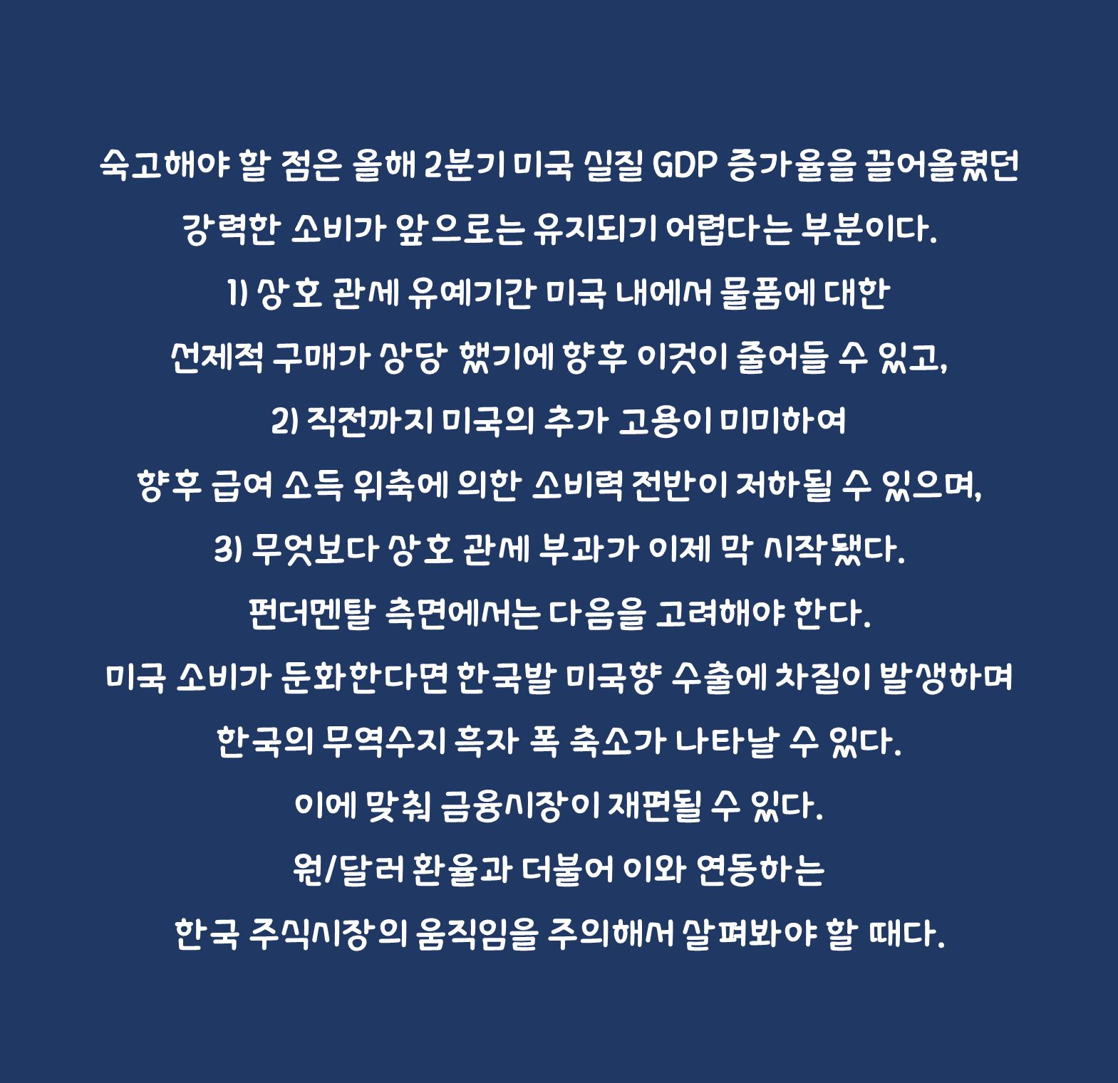 숙고해야 할 점은 올해 2분기 미국 실질 GDP 증가율을 끌어올렸던 강력한 소비가 앞으로는 유지되기 어렵다는 부분이다. 1) 상호 관세 유예기간 미국 내에서 물품에 대한 선제적 구매가 상당 했기에 향후 이것이 줄어들 수 있고, 2) 직전까지 미국의 추가 고용이 미미하여 향후 급여 소득 위축에 의한 소비력 전반이 저하될 수 있으며, 3) 무엇보다 상호 관세 부과가 이제 막 시작됐다.