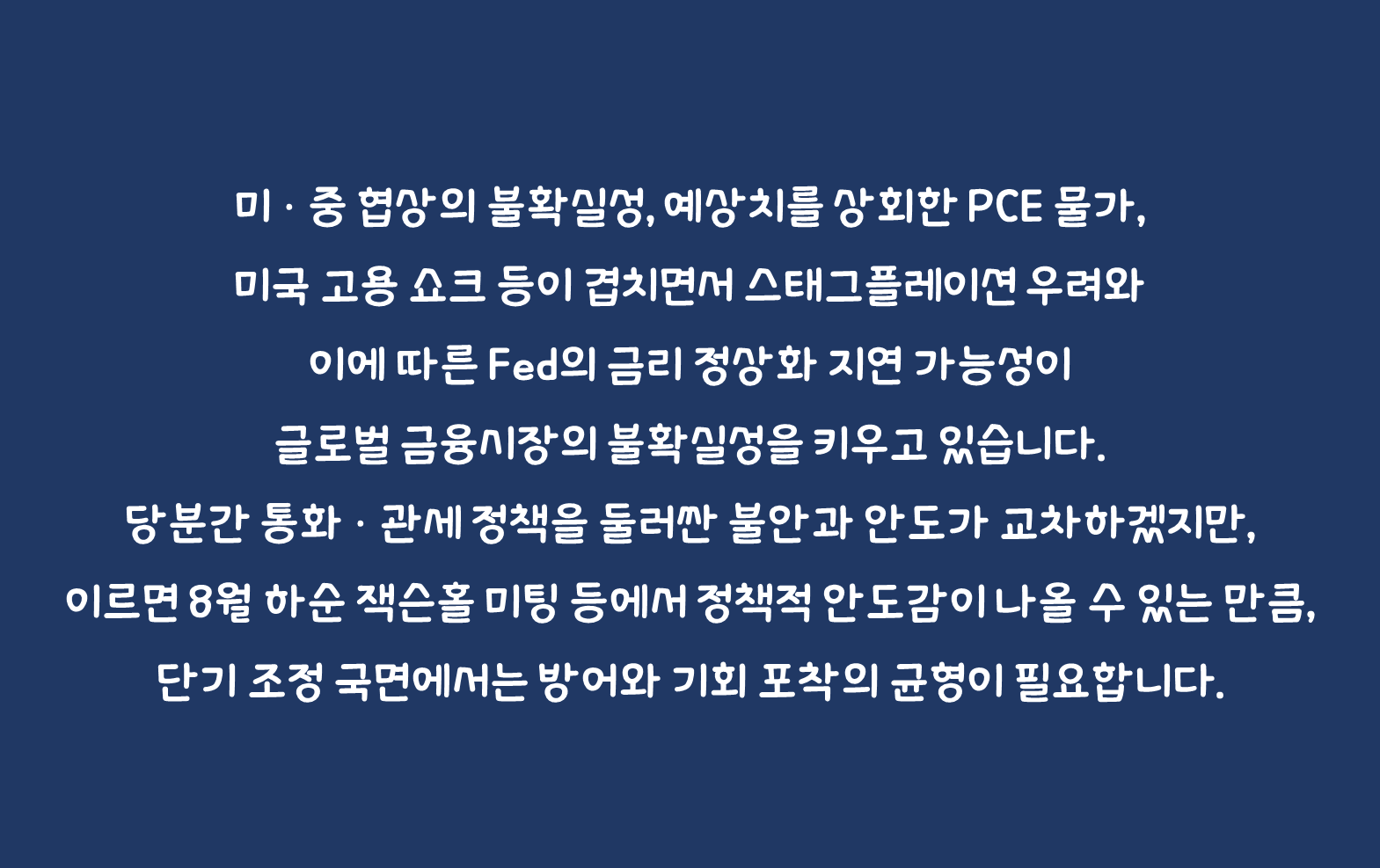 EU와 일본의 관세 완화에 따른 안도감에도 불구하고, 미·중 협상의 불확실성, 예상치를 상회한 PCE 물가, 미국 고용 쇼크 등이 겹치면서 스태그플레이션 우려와 이에 따른 Fed의 금리 정상화 지연 가능성이 글로벌 금융시장의 불확실성을 키우고 있습니다. 당분간 통화·관세 정책을 둘러싼 불안과 안도가 교차하겠지만, 이르면 8월 하순 잭슨홀 미팅 등에서 정책적 안도감이 나올 수 있는 만큼, 단기 조정 국면에서는 방어와 기회 포착의 균형이 필요합니다.