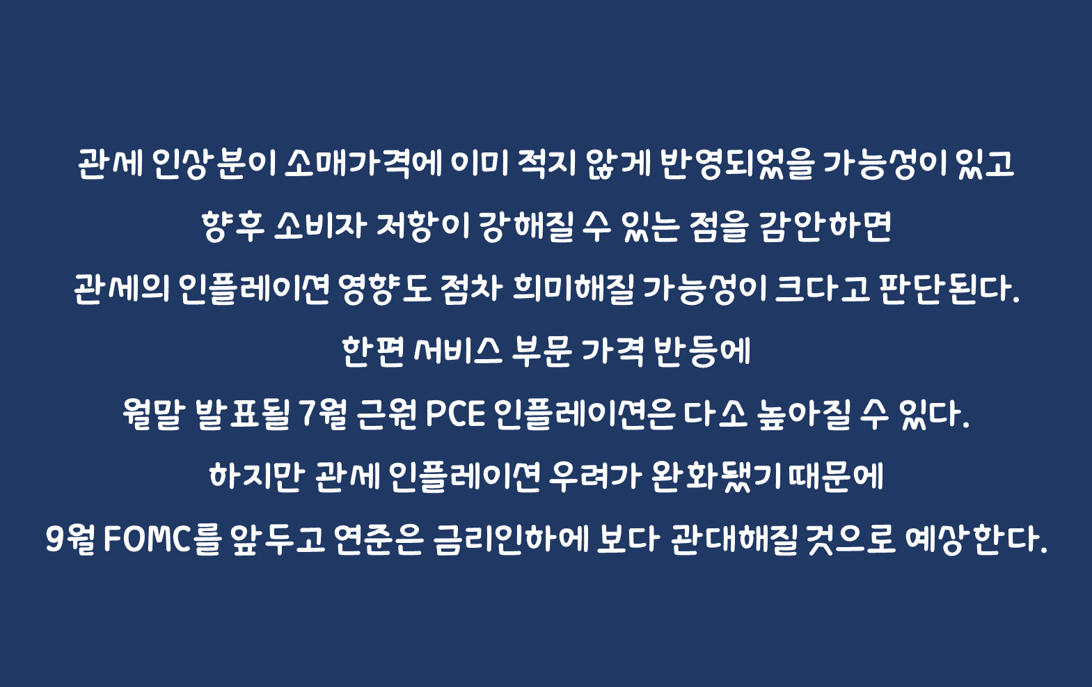 관세 인플레이션 우려 완화로 연준은 금리인하에 보다 관대해질 듯: 관세 인상분이 소매가격에 이미 적지 않게 반영되었을 가능성이 있고 향후 소비자 저항이 강해질 수 있는 점을 감안하면 관세의 인플레이션 영향도 점차 희미해질 가능성이 크다고 판단된다. 한편 서비스 부문 가격 반등에 월말 발표될 7월 근원 PCE 인플레이션은 다소 높아질 수 있다. 하지만 관세 인플레이션 우려가 완화됐기 때문에 9월 FOMC를 앞두고 연준은 금리인하에 보다 관대해질 것으로 예상한다.