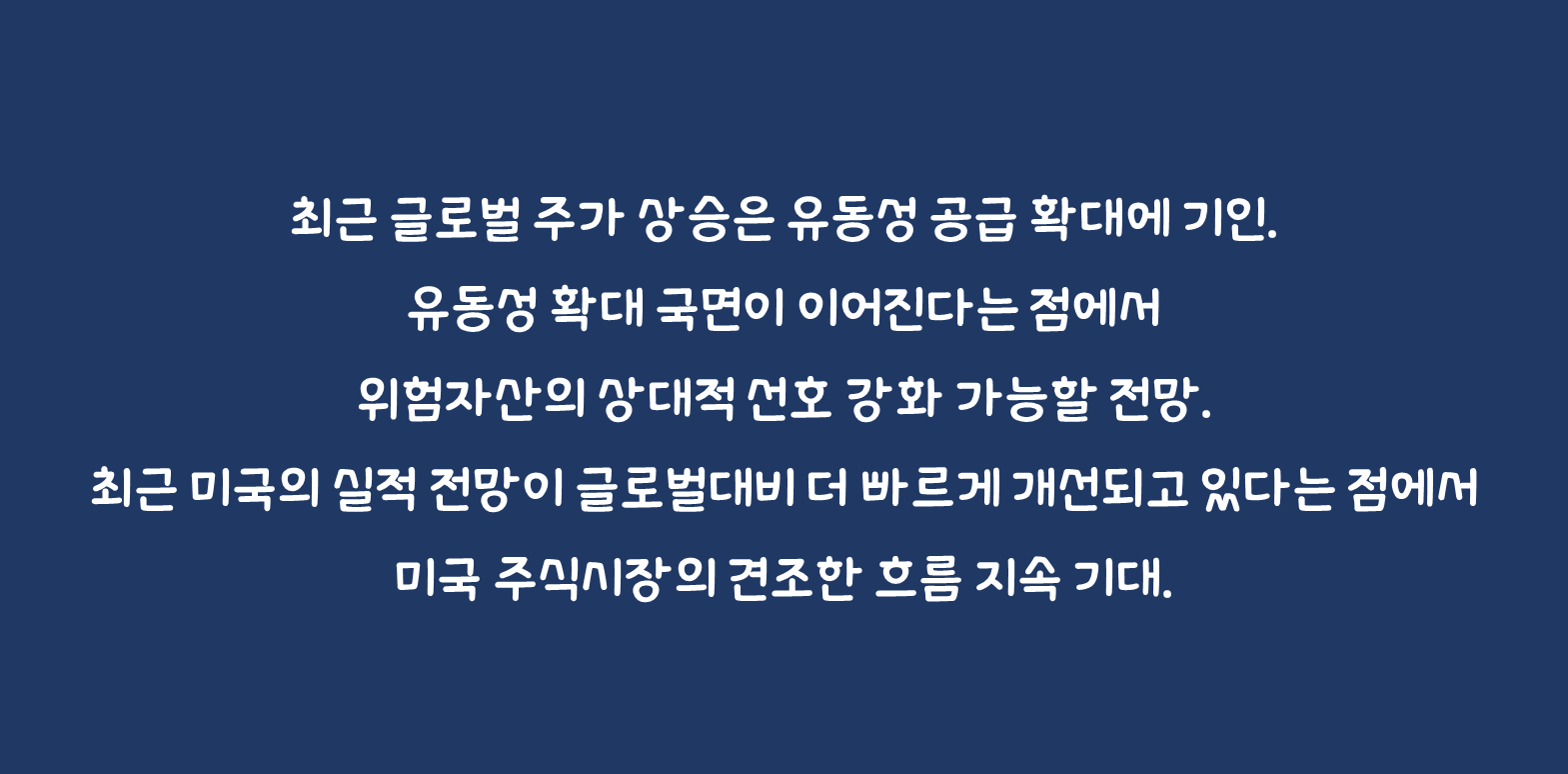 투자전략: 최근 글로벌 주가 상승은 유동성 공급 확대에 기인. 유동성 확대 국면이 이어진다는 점에서 위험자산의 상대적 선호 강화 가능할 전망. 최근 미국의 실적 전망이 글로벌대비 더 빠르게 개선되고 있다는 점에서 미국 주식시장의 견조한 흐름 지속 기대.