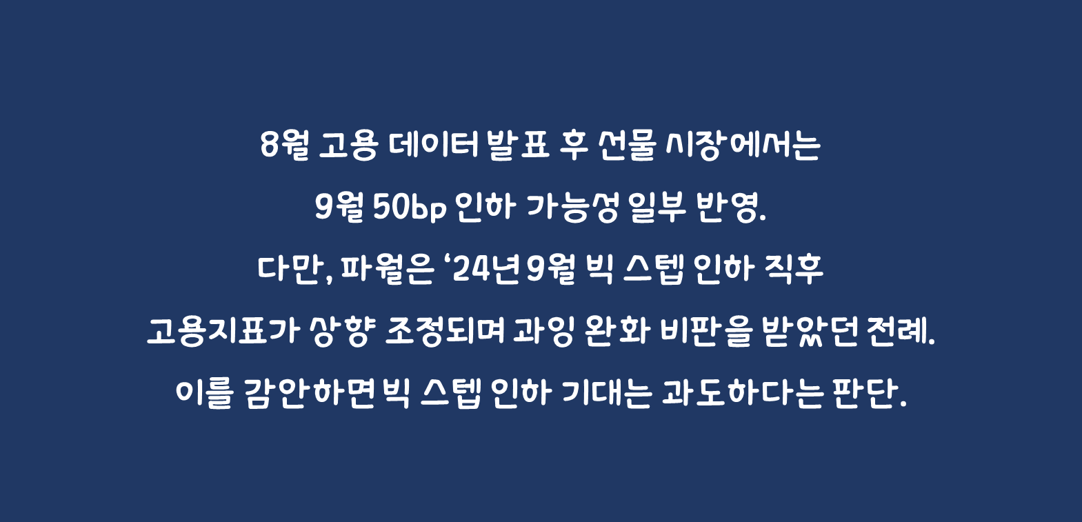 8월 고용 데이터 발표 후 선물 시장에서는 9월 50bp 인하 가능성 일부 반영. 다만, 파월은 ‘24년 9월 빅 스텝 인하 직후 고용지표가 상향 조정되며 과잉 완화 비판을 받았던 전례. 이를 감안하면 빅 스텝 인하 기대는 과도하다는 판단.