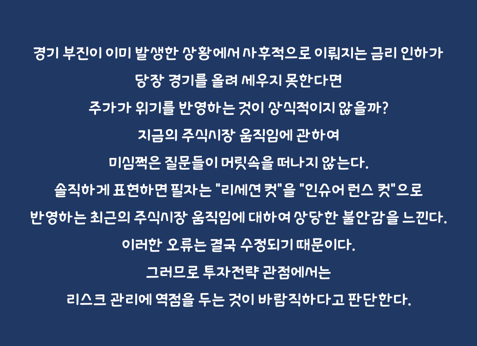경기 부진이 이미 발생한 상황에서 사후적으로 이뤄지는 금리 인하가 당장 경기를 올려 세우지 못한다면 주가가 위기를 반영하는 것이 상식적이지 않을까? 지금의 주식시장 움직임에 관하여 미심쩍은 질문들이 머릿속을 떠나지 않는다. 솔직하게 표현하면 필자는 "리세션 컷"을 "인슈어 런스 컷"으로 반영하는 최근의 주식시장 움직임에 대하여 상당한 불안감을 느낀다. 이러한 오류는 결국 수정되기 때문이다. 그러므로 투자전략 관점에서는 리스크 관리에 역점을 두는 것이 바람직하다고 판단한다. 상대 수익률 관점에서는 배당주를 추천한다. 주식시장의 변동성 확대 과정에서 배당주가 강건하다는 특징이 있으며, 금리 인하 시기에 배당주의 상대 성과가 양호하고, 하반기 배당주의 인기가 고조된다는 점을 활용할 필요가 있다.
