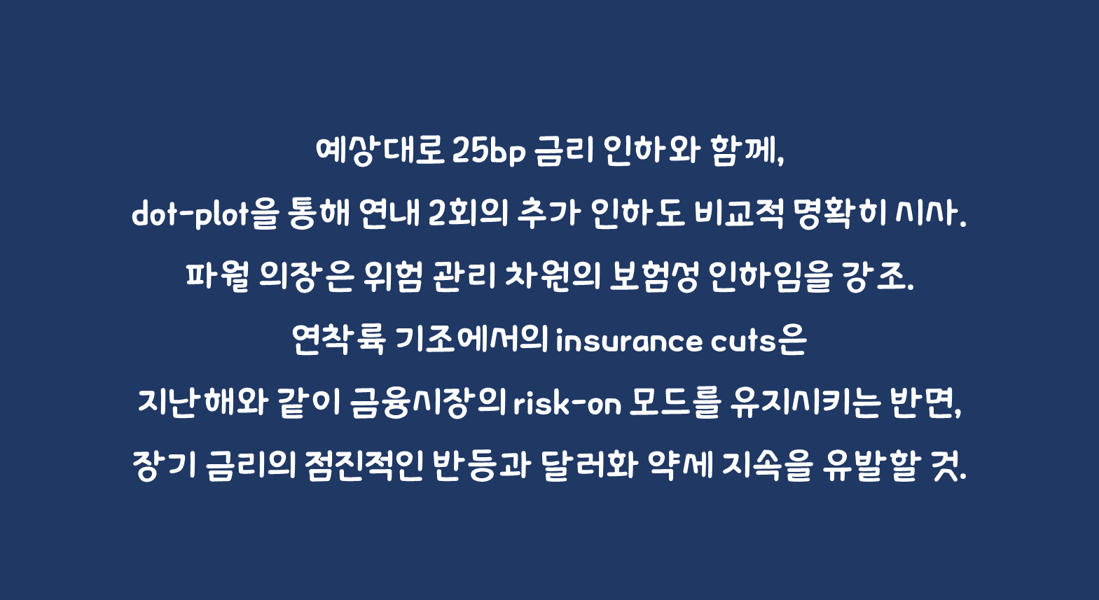 ✅당사 예상대로 25bp 금리 인하와 함께, dot-plot을 통해 연내 2회의 추가 인하도 비교적 명확히 시사. 파월 의장은 위험 관리 차원의 보험성 인하임을 강조.