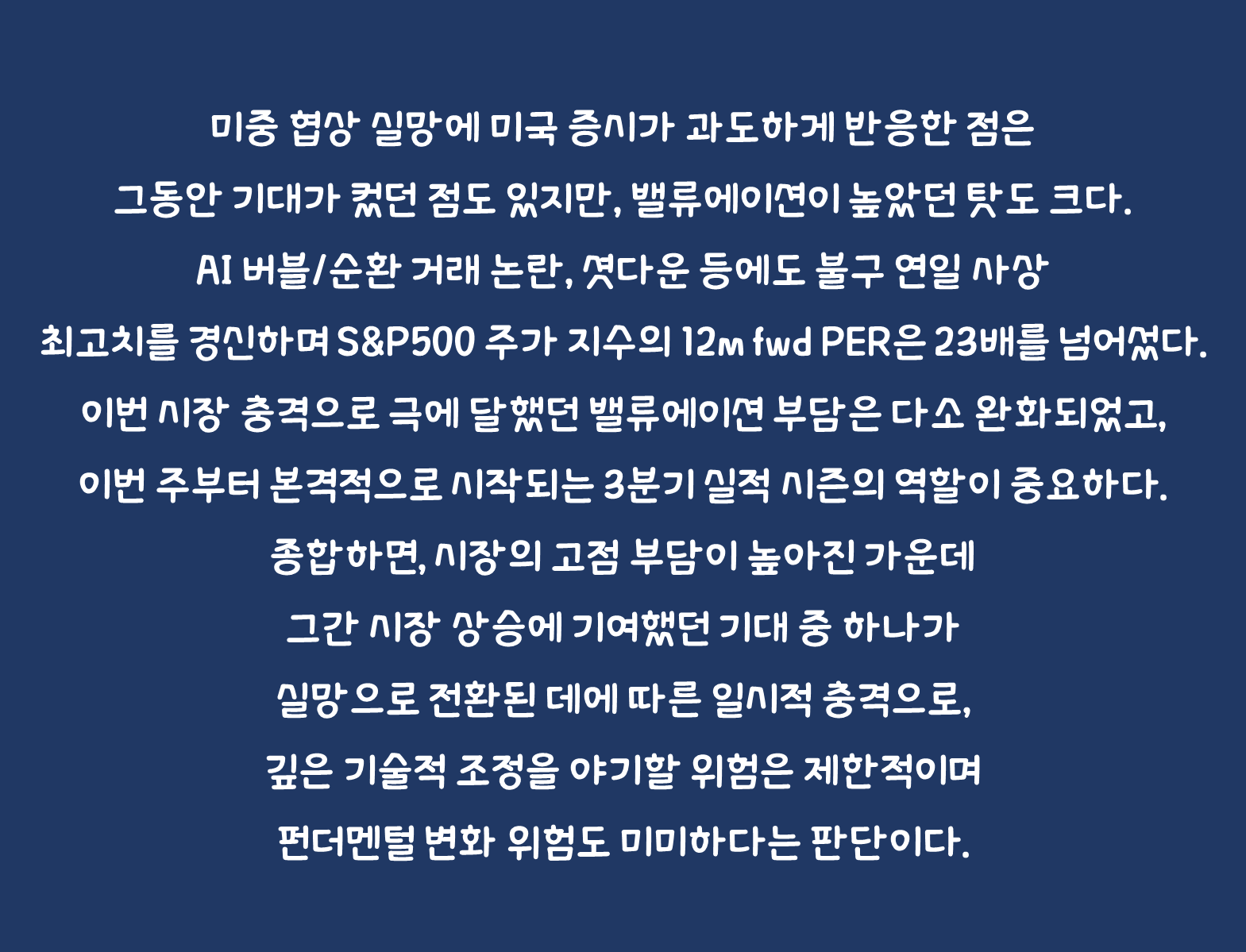 종합하면, 시장의 고점 부담이 높아진 가운데 그간 시장 상승에 기여했던 기대 중 하나가 실망으로 전환된 데에 따른 일시적 충격으로, 깊은 기술적 조정을 야기할 위험은 제한적이며 펀더멘털 변화 위험도 미미하다는 판단이다.