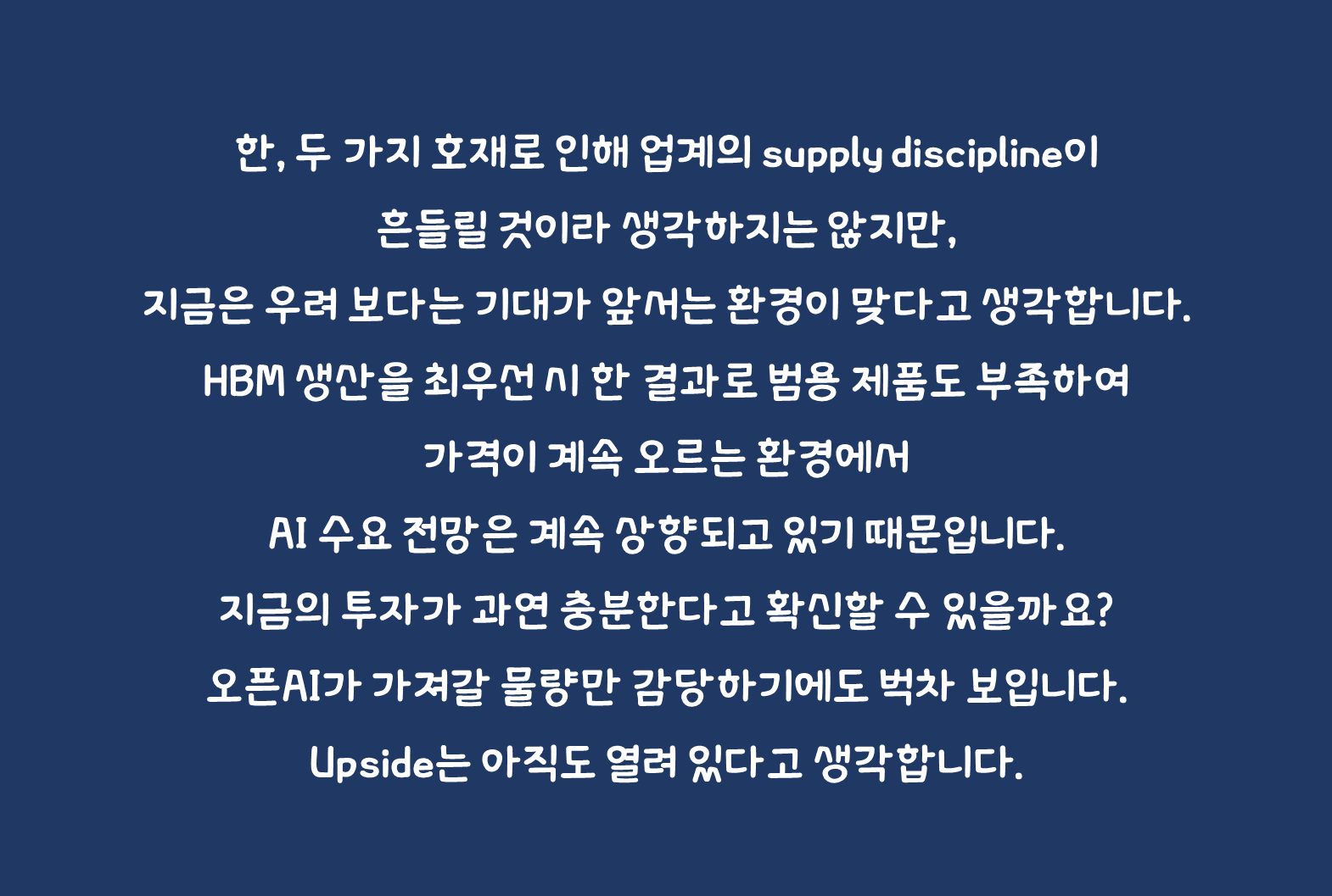 한, 두 가지 호재로 인해 업계의 supply discipline이 흔들릴 것이라 생각하지는 않지만, 지금은 우려 보다는 기대가 앞서는 환경이 맞다고 생각합니다. HBM 생산을 최우선 시 한 결과로 범용 제품도 부족하여 가격이 계속 오르는 환경에서 AI 수요 전망은 계속 상향되고 있기 때문입니다. 지금의 투자가 과연 충분한다고 확신할 수 있을까요? 오픈AI가 가져갈 물량만 감당하기에도 벅차 보입니다. Upside는 아직도 열려 있다고 생각합니다.
