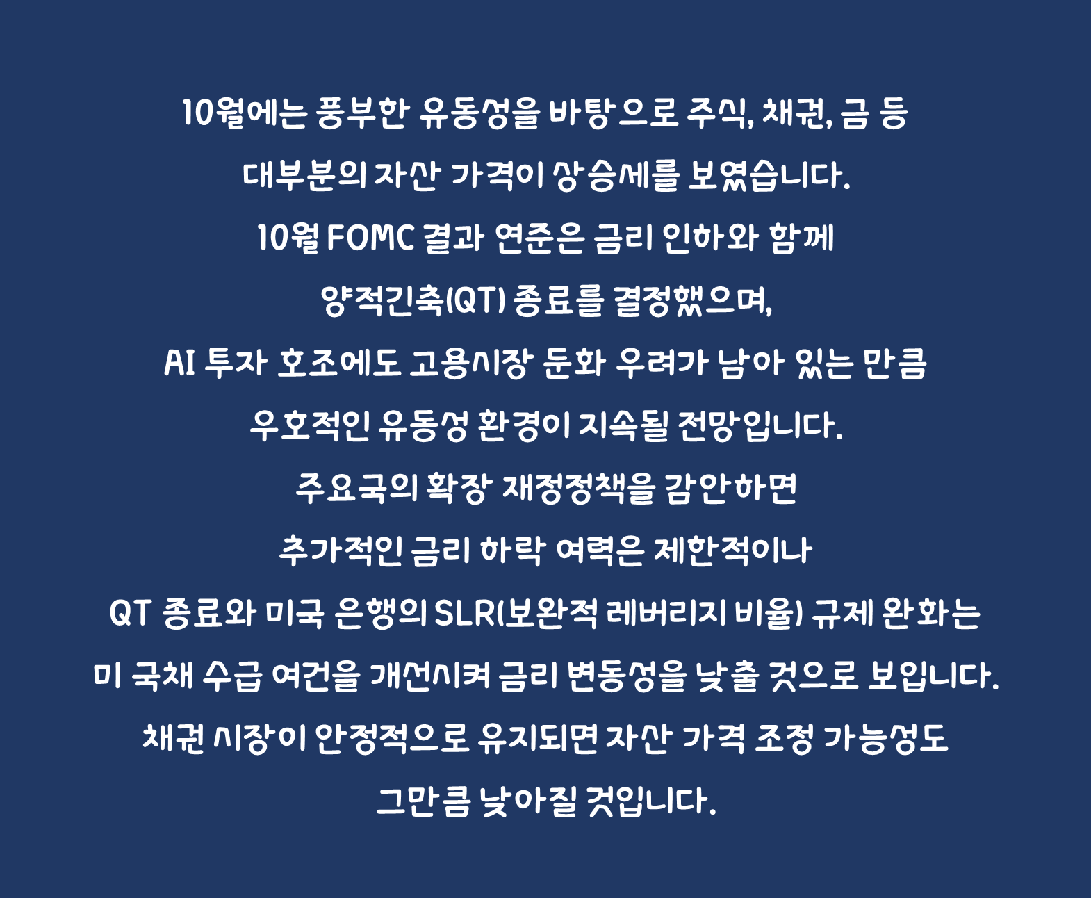 10월에는 풍부한 유동성을 바탕으로 주식, 채권, 금 등 대부분의 자산 가격이 상승세를 보였습니다. 10월 FOMC 결과 연준은 금리 인하와 함께 양적긴축(QT) 종료를 결정했으며, AI 투자 호조에도 고용시장 둔화 우려가 남아 있는 만큼 우호적인 유동성 환경이 지속될 전망입니다. 주요국의 확장 재정정책을 감안하면 추가적인 금리 하락 여력은 제한적이나 QT 종료와 미국 은행의 SLR(보완적 레버리지 비율) 규제 완화는 미 국채 수급 여건을 개선시켜 금리 변동성을 낮출 것으로 보입니다. 채권 시장이 안정적으로 유지되면 자산 가격 조정 가능성도 그만큼 낮아질 것입니다.