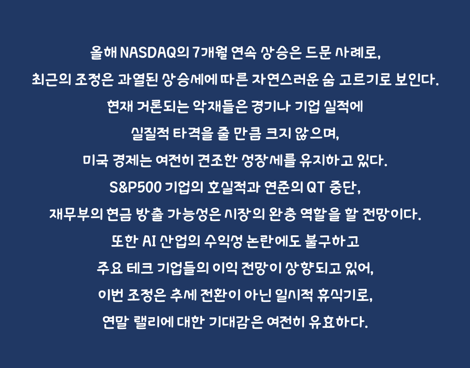 이처럼 현재 시장에서 논란이 되는 각종 악재들을 개별적으로 접근해 보면, 소음 이상의 의미를 부여하기는 당장 어렵다고 판단한다. 따라서 최근 뉴욕 증시의 상승 탄력세가 둔화된 것을 두고, 특별한 의미를 부여하기보다는 연속 상승에 따른 피로 누적으로 보는 것이 타당하다. 여전히 美 경기의 펀더멘털과 탄탄한 기업들의 실적, 그리고 AI 모멘텀이 현재 진행형임을 고려하면 연말 랠리에 대한 기대감은 유효할 것이다. 그렇다면 최근 조정 과정을 점진적 매수 기회로 활용할 필요가 있다. 마침 AI 관련 반도체 인프라, 그리고 클라우드 플랫폼 기업들의 기술적 과열 부담은 상당 부분 해소되었다.