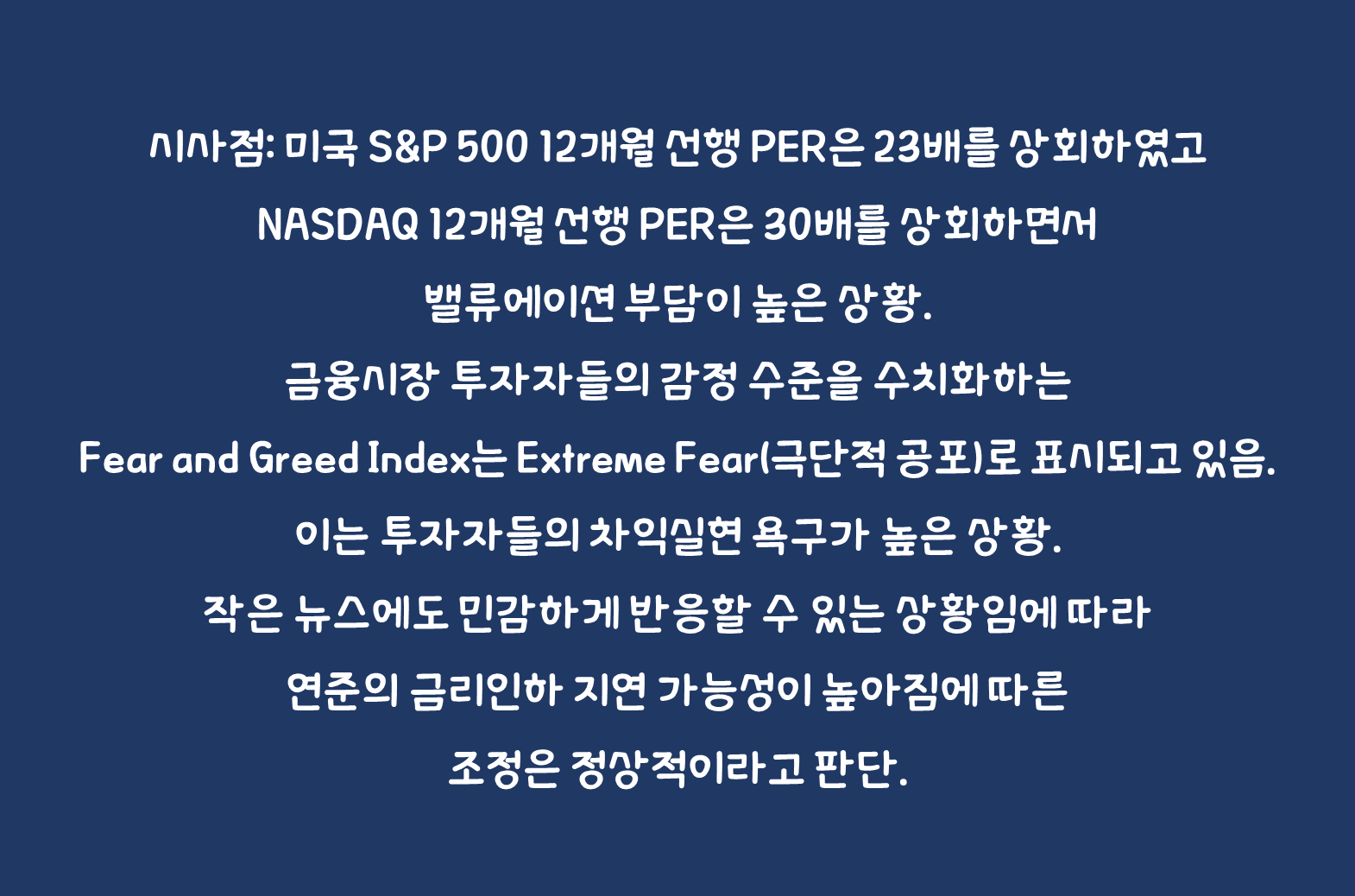 - 시사점: 미국 S&P 500 12개월 선행 PER은 23배를 상회하였고 NASDAQ 12개월 선행 PER은 30배를 상회하면서 밸류에이션 부담이 높은 상황. 금융시장 투자자들의 감정 수준을 수치화하는 Fear and Greed Index는 Extreme Fear(극단적 공포)로 표시되고 있음. 이는 투자자들의 차익실현 욕구가 높은 상황. 작은 뉴스에도 민감하게 반응할 수 있는 상황임에 따라 연준의 금리인하 지연 가능성이 높아짐에 따른 조정은 정상적이라고 판단.