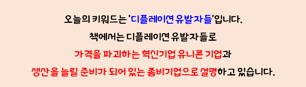 SK증권 자산전략팀장 이효석님의 저서 '나는 당신이 주식 공부를 시작했으면 좋겠습니다'에 나오는 내용입니다. 좋은 내용이 많아 틈틈이 반복해서 보고 있는 책이기도 하고요, 주요 내용 몇몇 뽑아서 포스팅하면서 공부하려고 생각하고 있습니다. 오늘의 키워드는 '디플레이션 유발자들'입니다. 책에서는 디플레이션 유발자들로 가격을 파괴하는 혁신기업 유니콘 기업과 생산을 늘릴 준비가 되어 있는 좀비기업, 양극화, AI의 침공으로 설명하고 있습니다.
