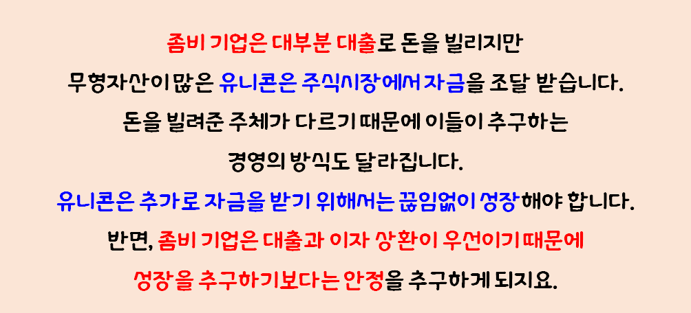 셋째, 돈을 빌려준 주체가 다르기 때문에 이들이 추구하는 경영의 방식도 달라집니다. 유니콘은 추가로 자금을 받기 위해서는 끊임없이 성장해야 합니다. 반면, 좀비 기업은 대출과 이자 상환이 우선이기 때문에 성장을 추구하기보다는 안정을 추구하게 되지요.