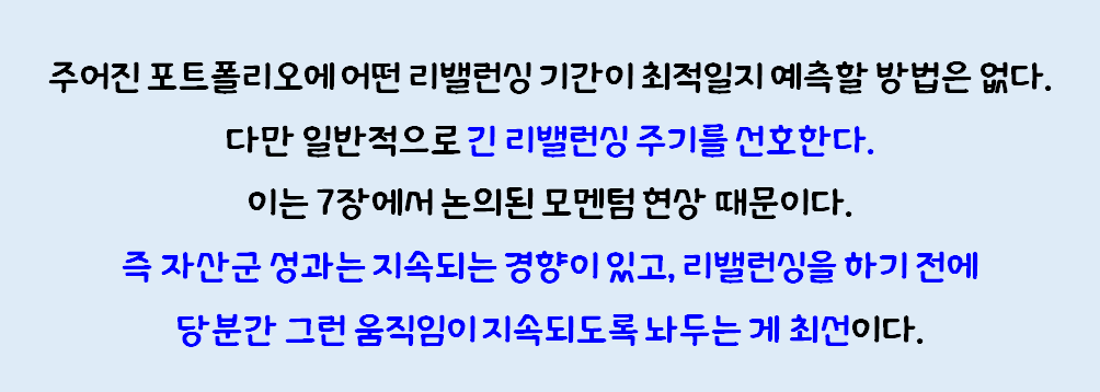 현명한 자산배분 투자자(윌리엄 번스타인 저)의 Part 8 자산배분 전략 실천하기에 나오는 최적의 리밸런싱 기간에 대한 내용 소개드립니다.