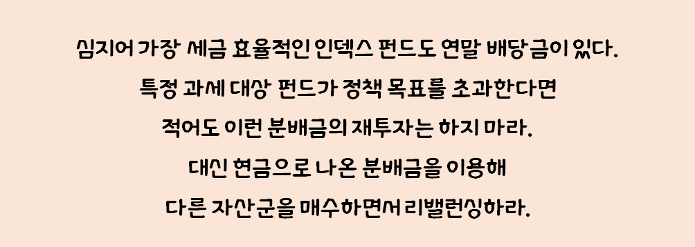 다음으로 뱅가드와 몇몇 다른 펀드 회사가 연말 잔고 추적 보고서로 삶을 꽤 편하게 만들어주긴 했지만, 과세 대상 펀드를 자주 사고파는 것은 회계 처리상의 악몽이 될 수 있다. 심지어 가장 세금 효율적인 인덱스 펀드도 연말 배당금이 있다. 특정 과세 대상 펀드가 정책 목표를 초과한다면 적어도 이런 분배금의 재투자는 하지 마라. 대신 현금으로 나온 분배금을 이용해 다른 자산군을 매수하면서 리밸런싱하라. 세금을 많이 내는 펀드에 자주 추가 납입하는 것은 좋지만 일 년에 한 번 정도만 팔 것을 권한다. 거래 전표와 계좌 내역서를 꼼꼼하게 보관하는 것을 잊지 마라. 이 문제는 회계사에게 도움을 청하라.