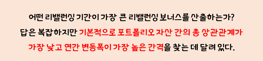 어떤 리밸런싱 기간이 가장 큰 리밸런싱 보너스를 산출하는가? 답은 복잡하지만 기본적으로 포트폴리오 자산 간의 총 상관관계가 가장 낮고 연간 변동폭이 가장 높은 간격을 찾는 데 달려 있다. 즉 특정 기간의 자산 분산과 상관계수는 사용되는 수익률 주기에 따라 다르다. 예를 들어 일별, 주별, 월별, 분기별, 연간 수익률이 사용된다. 자산 간 상관관계가 가장 낮고 분산이 가장 큰 구간이 최적의 리밸런싱 기간이다. 나는 유사한 포트폴리오의 경우 월별에서 몇 년에 한 번씩 최적의 리밸런싱 기간을 봐왔다.