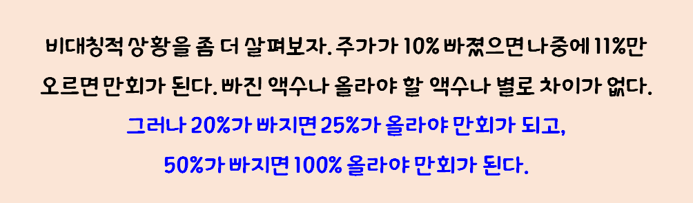 비대칭적 상황을 좀 더 살펴보자. 주가가 10% 빠졌으면 나중에 11%만 오르면 만회가 된다. 빠진 액수나 올라야 할 액수나 별로 차이가 없다. 그러나 20%가 빠지면 25%가 올라야 만회가 되고, 50%가 빠지면 100% 올라야 만회가 된다. 떨어진 비율이 높을수록 올라야 할 비율도 기하급수적으로 늘어나 90%가 빠지면 1,000%, 즉 무려 10배가 올라야 만회가 된다. 이론상으로는 어떨지 모르지만 현실적으로는 만회가 불가능에 가깝다.