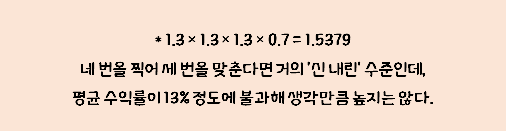 즉 세 번의 투자로 0.18, 18%의 수익을 내니 평균하면 한 번에 6%의 수익 밖에 내지 못하는 것이다. 만약 네 번에 세 번을 맞추는 차트도사가 있다고 하면 어떻게 될까? 계산방법은 동일하다. 1.3을 세 번 곱하고, 0.7을 한 번 곱하면 되므로 1.5379, 즉 53% 정도의 수익률이 나온다. 네 번을 찍어 세 번을 맞춘다면 거의 '신 내린' 수준인데, 평균 수익률이 13% 정도에 불과해 생각만큼 높지는 않다.
