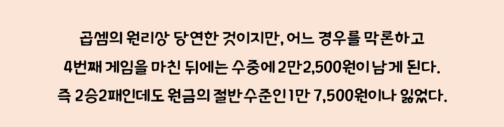 만일 이 도박사가 10게임을 하여 6승4패를 한 상황이라면 어떻게 될까? 이 경우에 도박사의 수중에 남아 있는 돈은 얼마나 될까? 놀랍게도 2만8,440원에 불과하다. 두 번이나 더 이겼는데도 적자를 면치 못하고 있는 것이다.