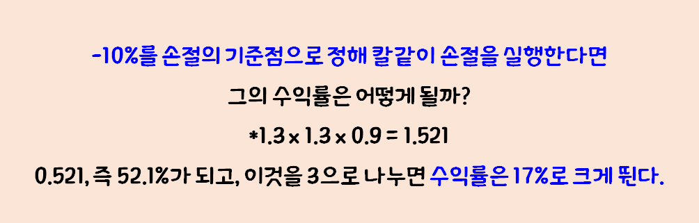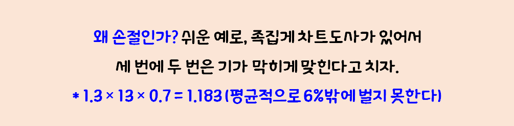 왜 손절인가? 쉬운 예로, 족집게 차트도사가 있어서 세 번에 두 번은기가 막히게 맞힌다고 치자. 한 번 맞힐 때마다 30%를 따고, 맞히지 못했을 때는 30%를 잃는다고 하면 이 차트도사의 평균수익률은 어떻게 될까? 언뜻 생각하면 67%의 적중률을 가지고 있으니 대단히 높은 수익률을 보일 것 같지만, 평균적으로 6%밖에 벌지 못한다.