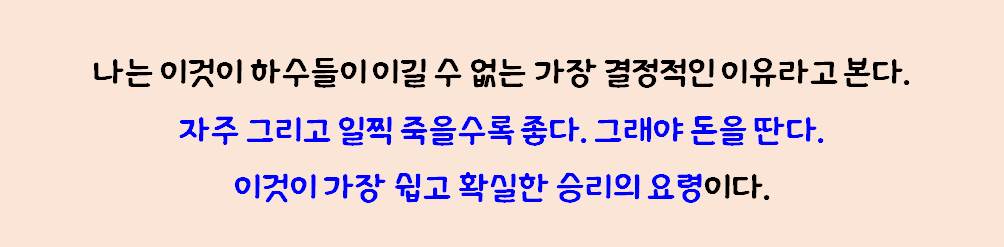 포커판이든, 주식투자에서든 하수들의 공통점은 물러설 줄을 모른다는 데 있다. 하수들일수록 패를 내려놓는 속도가 느리다. 마치 불나방처럼 달려들어 매 판마다 처절한 사투를 벌이는데, 나는 이것이 하수들이 이길 수 없는 가장 결정적인 이유라고 본다. 자주 그리고 일찍 죽을수록 좋다. 그래야 돈을 딴다. 이것이 가장 쉽고 확실한 승리의 요령이다.