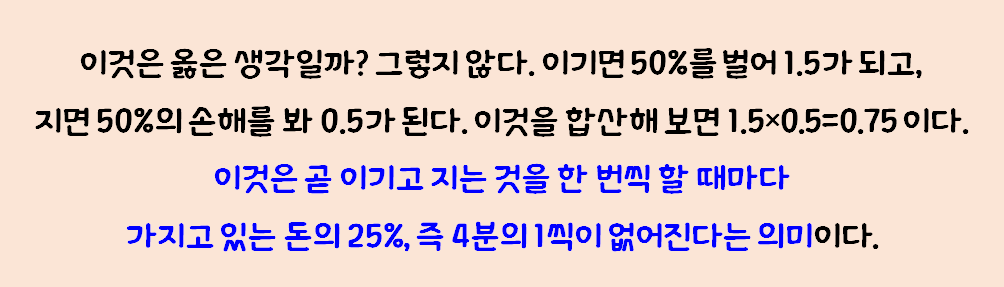 이것은 옳은 생각일까? 그렇지 않다. 이기면 50%를 벌어 1.5가되고, 지면 50%의 손해를 봐 0.5가 된다. 이것을 합산해 보면 1.5×0.5=0.75 이다. 이것은 곧 이기고 지는 것을 한 번씩 할 때마다 가지고 있는 돈의 25%, 즉 4분의 1씩이 없어진다는 의미이다. 믿기 어려우면 계산기를 놓고 실제로 한 번 해보자.
