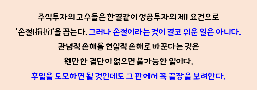 주식투자의 고수들은 한결같이 성공투자의 제1 요건으로 '손절(損折)'을 꼽는다. 그러나 손절이라는 것이 결코 쉬운 일은 아니다. 필자도 주식투자를 하기는 하지만, 손절을 실행에 옮긴 적은 손가락으로 꼽을 정도이다. 관념적 손해를 현실적 손해로 바꾼다는 것은 웬만한 결단이 없으면 불가능한 일이다. 하수들이 손에 든 패를 쉽게 내려놓지 못하는 이유도 아마 마찬가지일 것이다. 후일을 도모하면 될 것인데도 그 판에서 꼭 끝장을 보려한다. 그러니 쫓아가면서 두들겨 맞고, 홧김에 블러핑을 쳤다가 다시 한 번 두들겨 맞는 식으로 되로 주고 끝낼 일을 말로 주고 끝낸다.