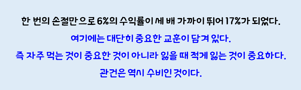 0.521, 즉 52.1%가 되고, 이것을 3으로 나누면 수익률은 17%로 크게 뛴다. 한 번의 손절만으로 6%의 수익률이 세 배 가까이 뛰어 17%가 되었다. 또한 이것은 네 번에 세 번을 맞추는 신 내린 수준의 차트도사가 올린 13%의 수익률보다도 더 높은 수치이다. 가상적인 모델이긴 하지만, 여기에는 대단히 중요한 교훈이 담겨 있다. 즉 자주 먹는 것이 중요한 것이 아니라 잃을 때 적게 잃는 것이 중요하다. 관건은 역시 수비인 것이다.