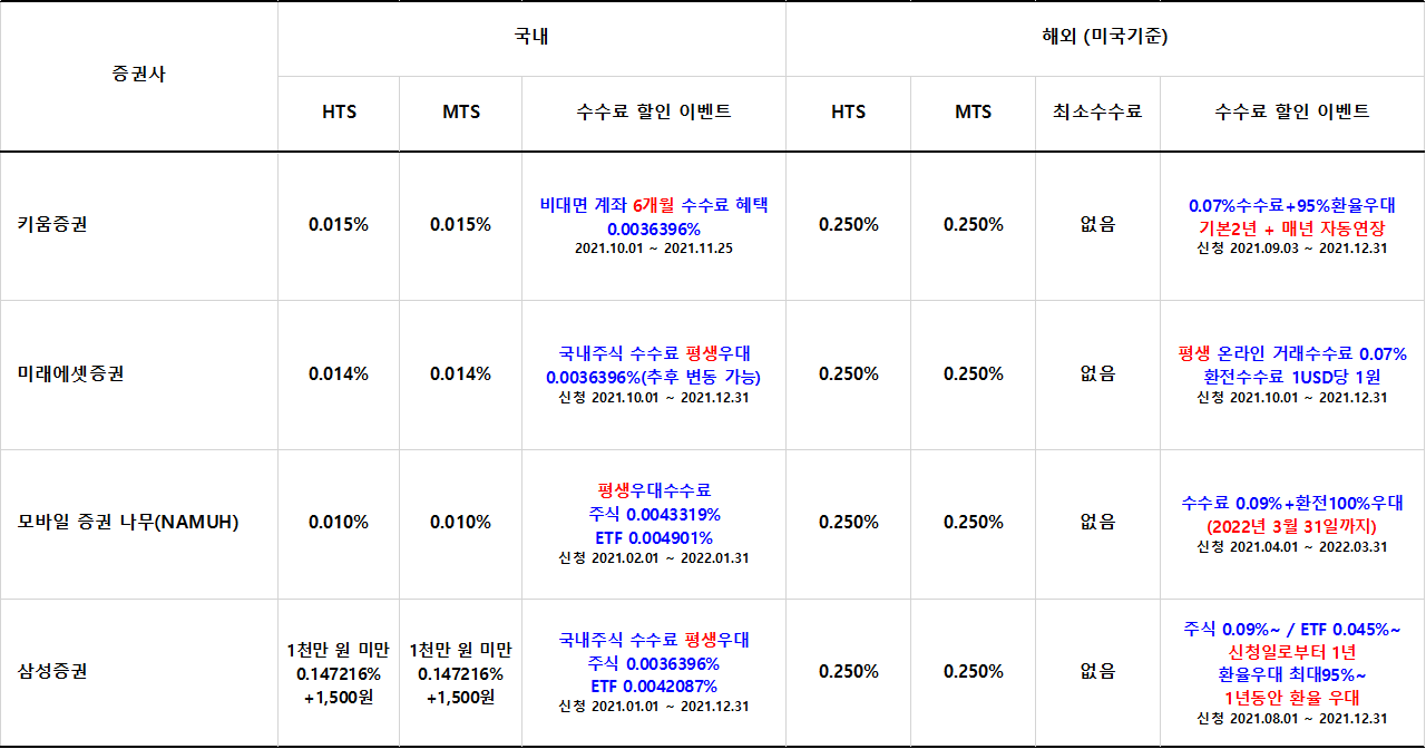 증권사별 수수료, 이벤트 비교표 (비대면계좌기준) / 2021.11
