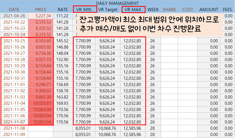 잔고평가액이 최소 최대 범위 안에 위치하므로 추가 매수/매도 없이 이번 차수 진행완료
