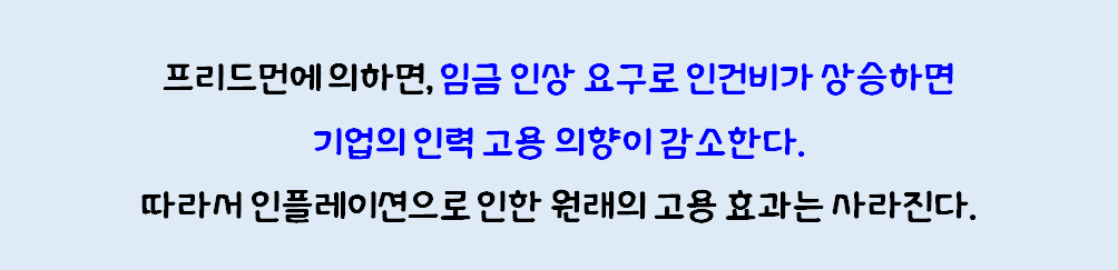 물론 실질 임금이 감소하기 때문에 단기적으로 인플레이션은 상승한다. 그러나 중기적으로 노동자들은 실질 임금이 감소한다는 사실을 알아챌 수밖에 없기 때문에 임금 인상을 요구하게 되어 있다.는 것이다. 실질 임금이 상승하면 원래의 고용 효과는 사라지고 없으므로 프리드먼은 중기적으로 필립스곡선이 성립하지 않는다고 주장했다.