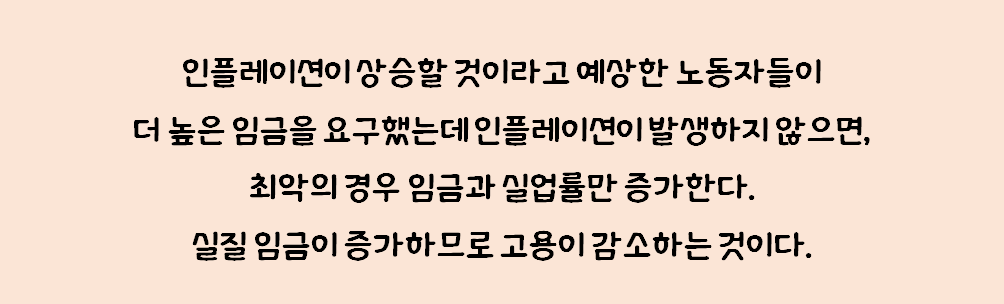 인플레이션이 상승할 것이라고 예상한 노동자들이 더 높은 임금을 요구했는데 인플레이션이 발생하지 않으면, 최악의 경우 임금과 실업률만 증가한다. 실질 임금이 증가하므로 고용이 감소하는 것이다. 잘못된 예측이 한 나라를 경기침체로 몰고 갈 수 있음을 통찰한 루카스의 주장은 탁월하다.