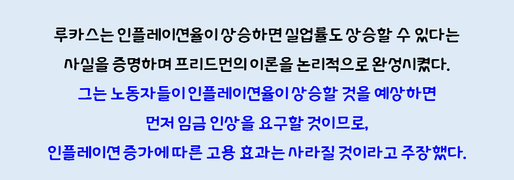 1995년에는 노벨경제학상 수상자인 로버트 루카스 Robert Lucas가 등장하면서 필립스곡선에 대한 비판이 더 심해졌다. 루카스는 인플레이션율이 상승하면 실업률도 상승할 수 있다는 사실을 증명하며 프리드먼의 이론을 논리적으로 완성시켰다. 그는 노동자들이 인플레이션율이 상승할 것을 예상하면 먼저 임금 인상을 요구할 것이므로, 인플레이션 증가에 따른 고용 효과는 사라질 것이라고 주장했다. 프리드먼은 일시적으로 고용이 증대되는 효과가 있다고 본 반면, 루카스는 노동자들이 상황을 바르게 판단하면 인플레이션으로 인해 고용이 증대하는 효과는 없어진다고 보았다.