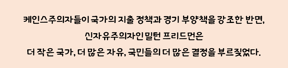 밀턴 프리드먼은 155 센티미터밖에 되지 않는 작은 체구를 가졌지만 진정한 거인이었다. 그는 20세기의 영향력 있는 경제학자로 손꼽히며 케인스에 버금가는 업적을 남긴 인물이다. 작은 체구와 급진적 사상 때문에 '시카고의 미친 난쟁이'라며 비웃음을 사기도 했지만, 케인스와 쌍벽을 이루는 위대한 사상가였다. 케인스주의자들이 국가의 지출 정책과 경기 부양책을 강조한 반면, 신자유주의자인 밀턴 프리드먼은 더 작은 국가, 더 많은 자유, 국민들의 더 많은 결정을 부르짖었다.
