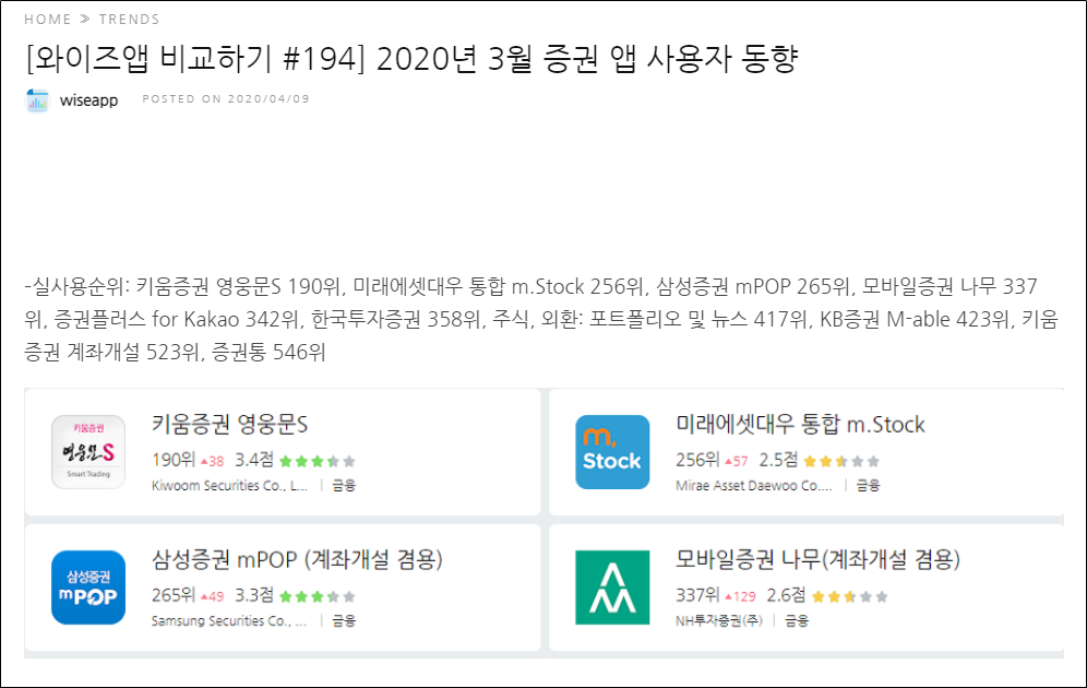 증권사별 수수료 기준 정리하고 가겠습니다. 수수료도 중요하지만 인터넷에서 쉽게 HTS / MTS 이용방법을 찾으려면 아무래도 사람들이 많이 쓰는 증권사를 이용하는 것도 중요할 것 같은데요, 와이즈앱 기준으로 가장 많이 쓰는 MTS는 키움증권 영운문S였습니다. 다만, 키움 특유의 오래된 UI로 인해 미래에셋증권 카이로스를 선호하시는 분도 많이 있다는 점 참고하면 될 것 같네요!