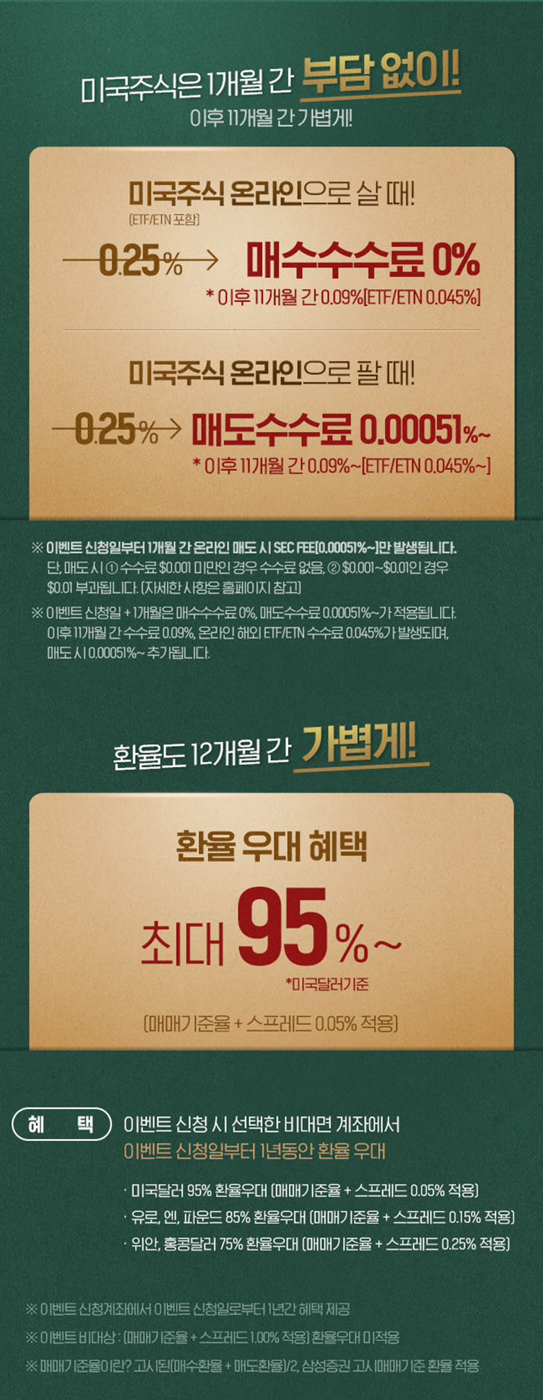 이벤트가 워낙 크고 다양해서 기본 수수료를 보는 것보다 이벤트를 챙겨가는 게 더 좋아 보이는데요, 모바일 증권 나무의 혜택이 가장 좋아 보입니다. 국내 주식 평생 우대 수수료와 해외주식 환전우대 100% 적용! 사람들이 많이 쓰는 기준으로는, 키움증권과 미래에셋증권을 봐야 하는데요, 미래에셋증권의 국내 주식 수수료 평생 우대 챙겨가고, 해외주식에서는 키움증권의 95% 환율우대(기본 1년 + 추가 1년) 챙겨가면 좋을 것 같습니다!