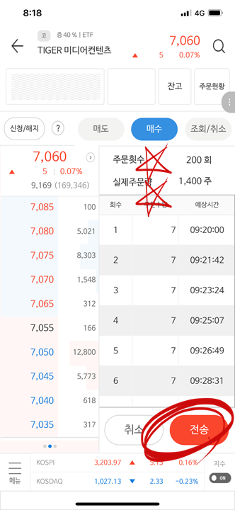전송 누르면 매수주문이 균등하게 나가게 됩니다