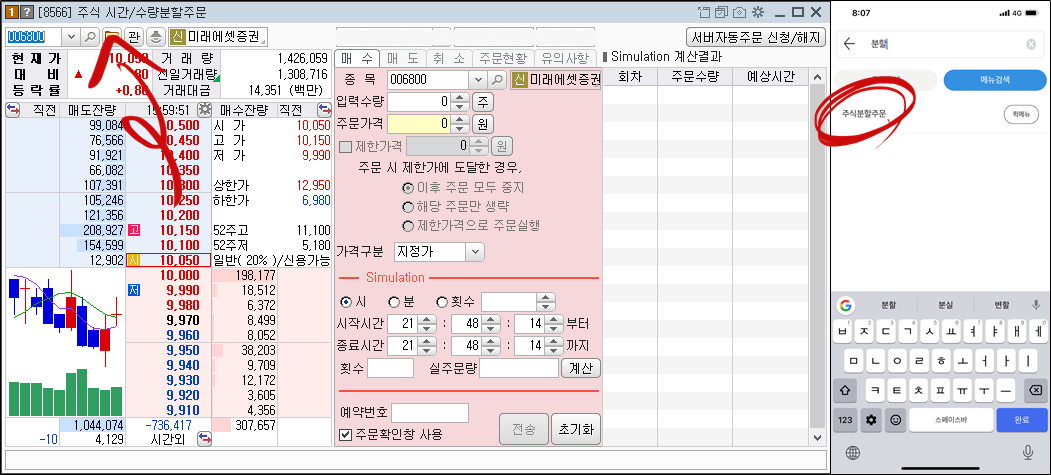 카이로스 HTS - 메뉴 검색 - '분할' 검색 - [8566] 주식 시간/수량 분할 주문