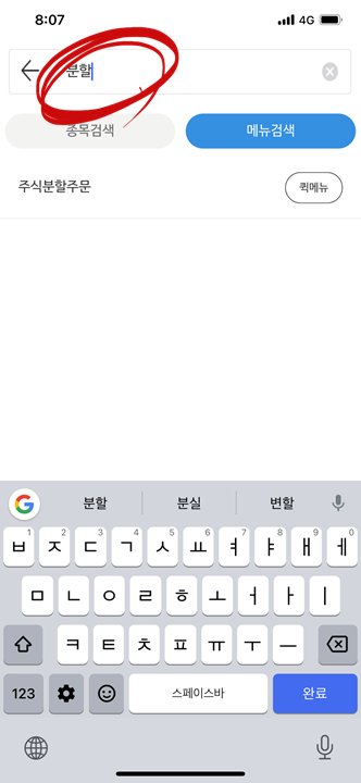 카이로스 MTS - 메뉴 검색 - '분할' 검색 - 주식분할주문