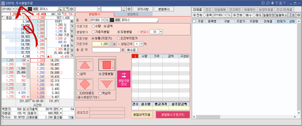 ※수량 분할이란? 주문 수량을 장중 거래량에 따라 배분하여 시장 평균 가격을 추구하는 주문입니다