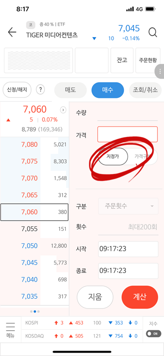 매수 화면에서 가격 선택해 주세요