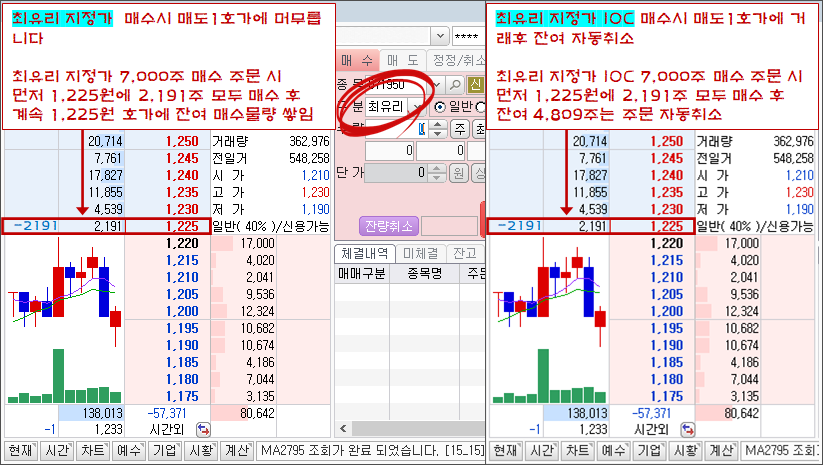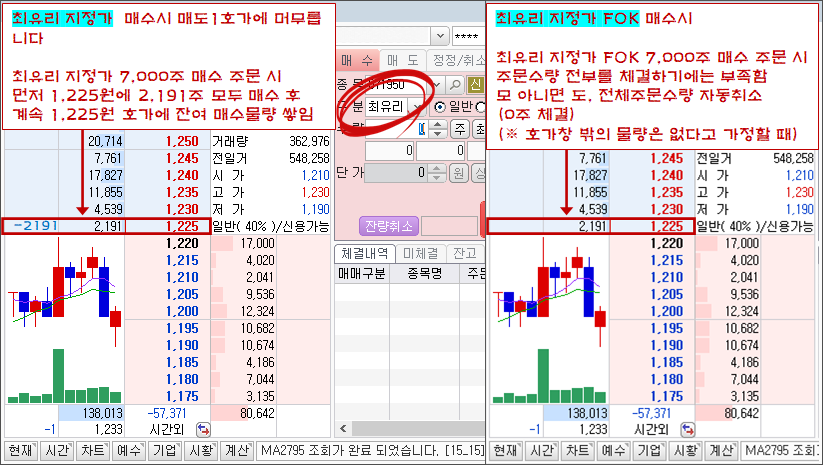 위 상황에서 최유리 지정가로 매수를 내면 1,225원에 매수주문이 나갑니다. 그나마 1,225원이 거래 가능한 범위에서 가장 낮은 매도 주문 가이고, 매수자에게는 거꾸로 가장 유리한 가격이에요. 반대로, 최유리 지정가로 매도를 내면 1,220원에 매도주문이 나가게 됩니다. 현재 1,220원보다 높은 값에 사려는 물량이 없기 때문이에요. 그나마 1,220원이 거래 가능한 범위에서는 가장 높은 매수 주문 가이고, 매도자에게는 거꾸로 가장 유리한 가격이에요.