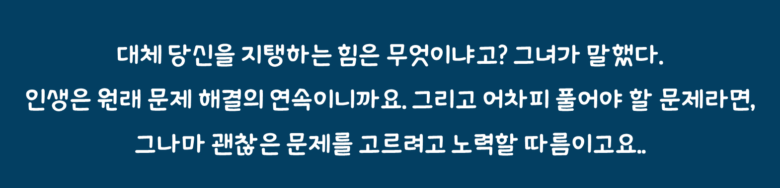 정 작가가 마스크 위로 초롱초롱한 눈동자를 빛내며 말했다. 자신의 비극을 웃으며 말하는 그녀의 모습에서 알찬 기운이 느껴졌다. 그건 꿈을 품고 사는 사람이 가진 힘이 아닐까? 새벽의 편의점에서 우리는 이야기했다. 그녀는 내 과거를 캐내기 위해 자신의 과거도 많이 털어놓았다. 나는 자기가 하고자 하는 일에 절대 지치지않는 그녀의 에너지가 부러웠다. 그래서 물었다. 대체 당신을 지탱하는 힘은 무엇이냐고? 그녀가 말했다. 인생은 원래 문제 해결의 연속이니까요. 그리고 어차피 풀어야 할 문제라면, 그나마 괜찮은 문제를 고르려고 노력할 따름이고요..